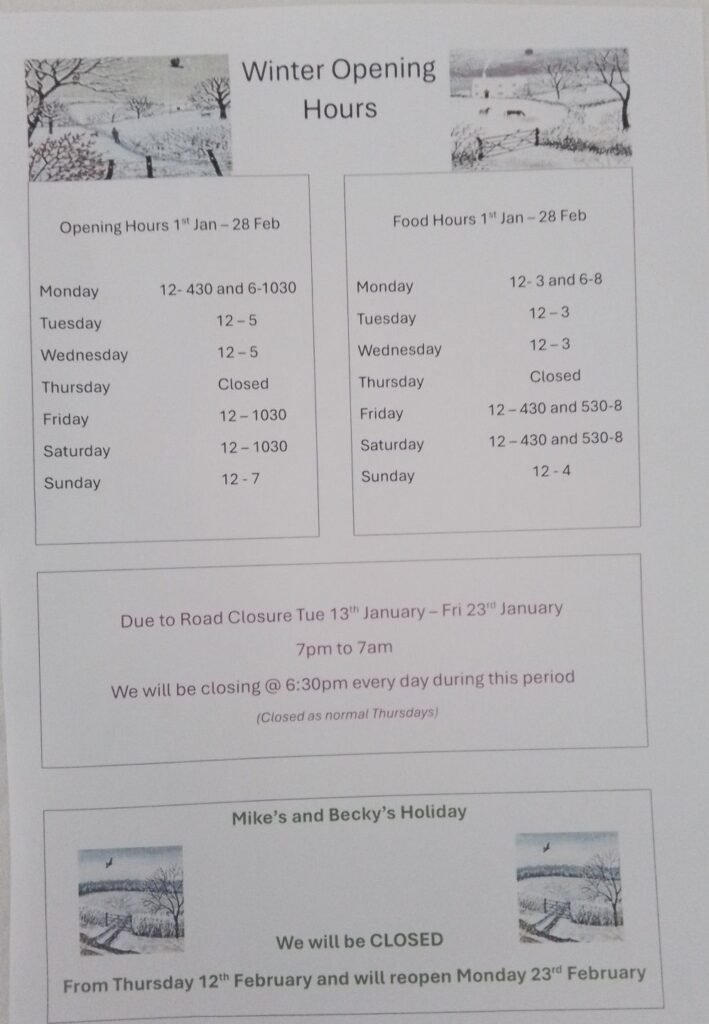 Winter Opening Hours Jan-Feb 2026 Posted on January 15, 2026January 15, 2026 Happy New Year to you all! Please see our temporary Winter opening hours on the leaflet attached.